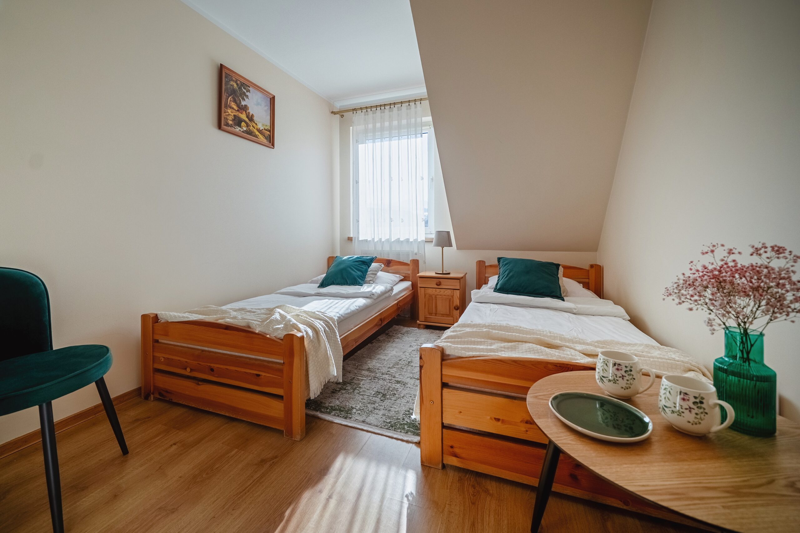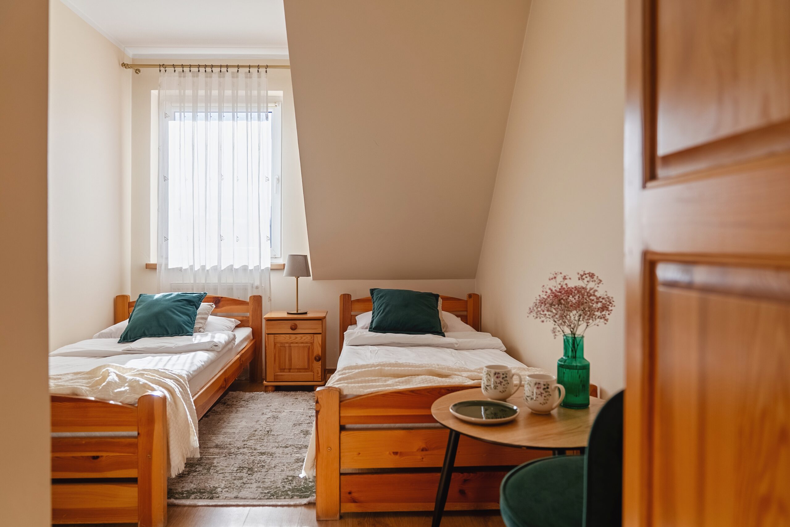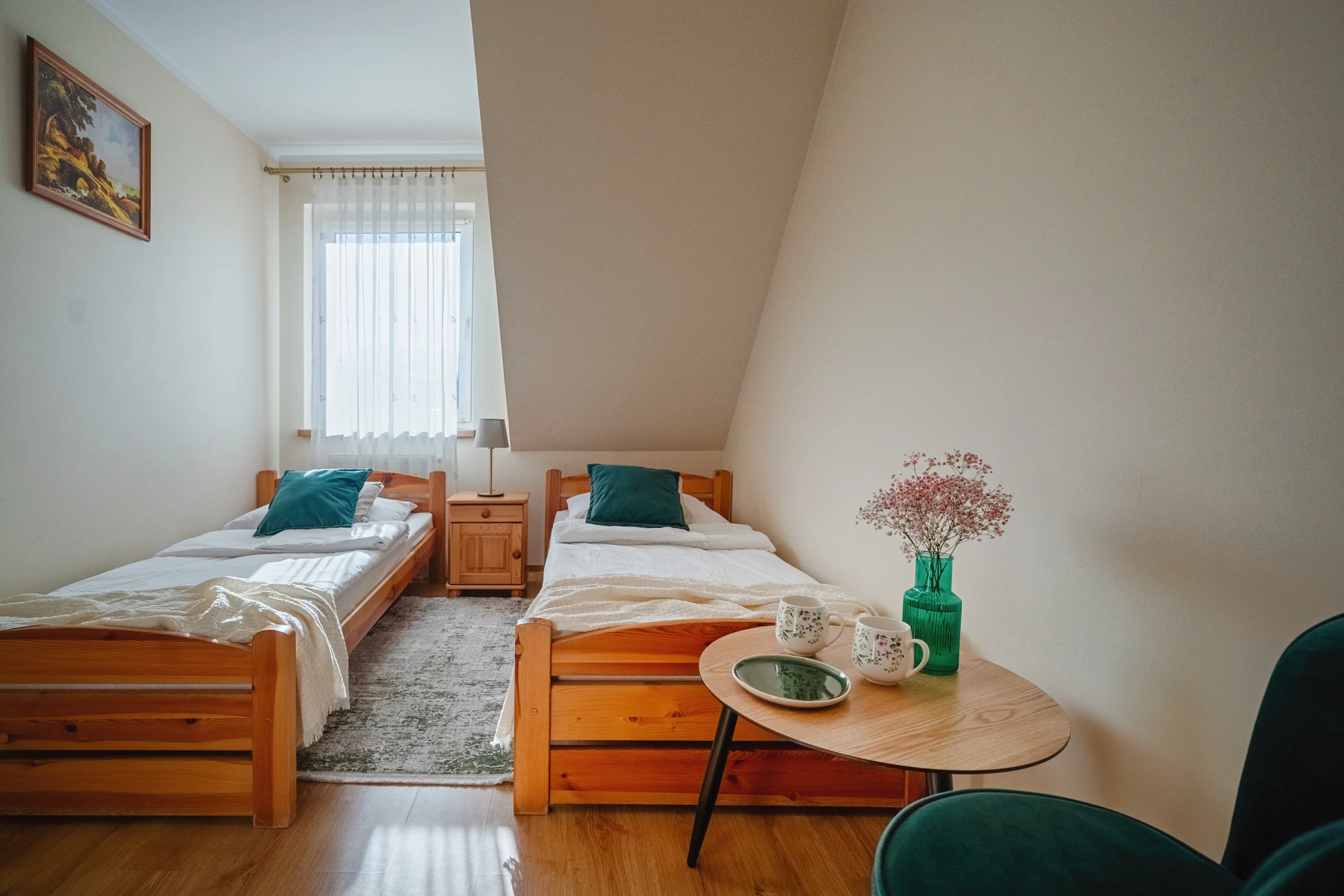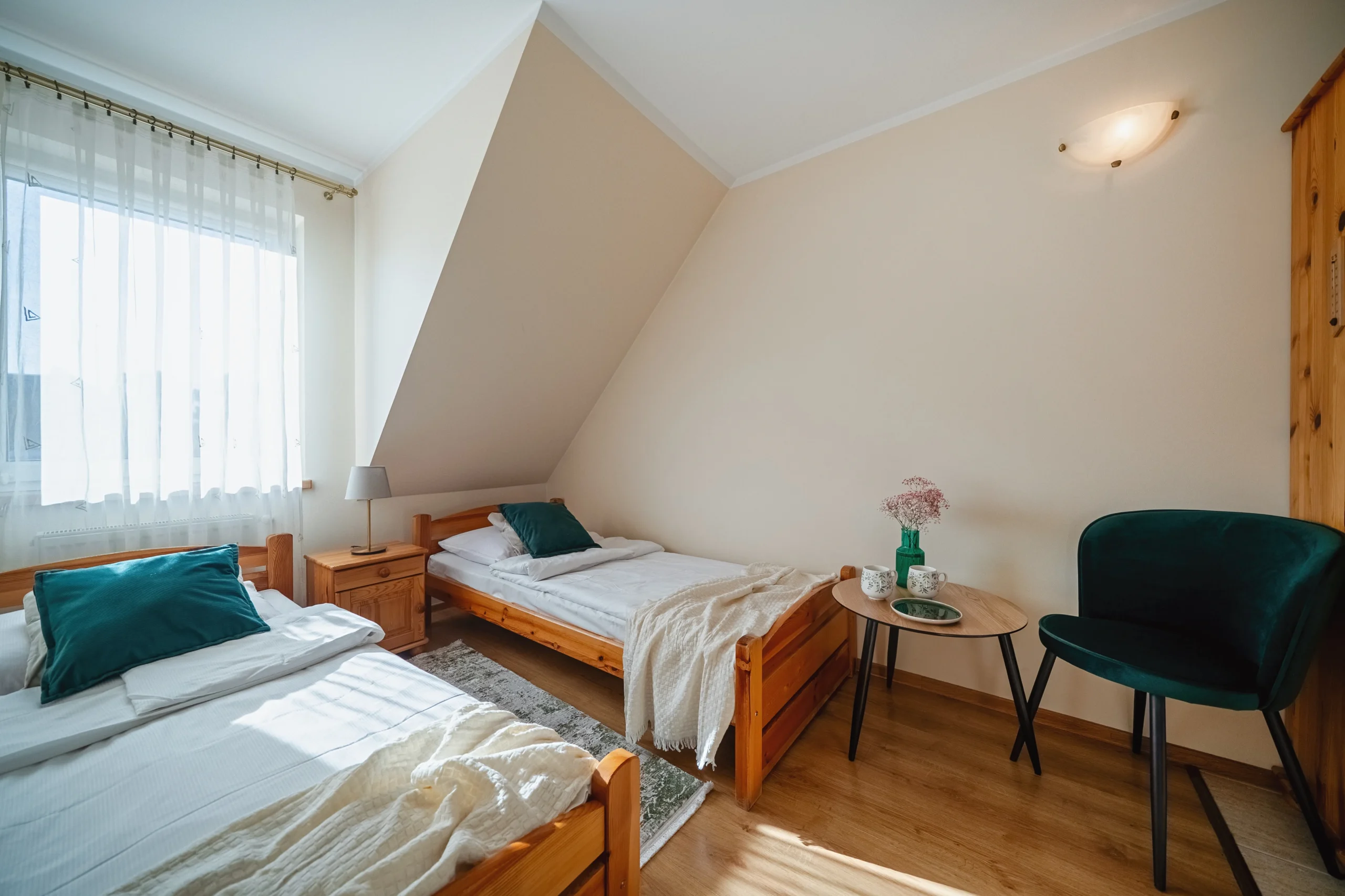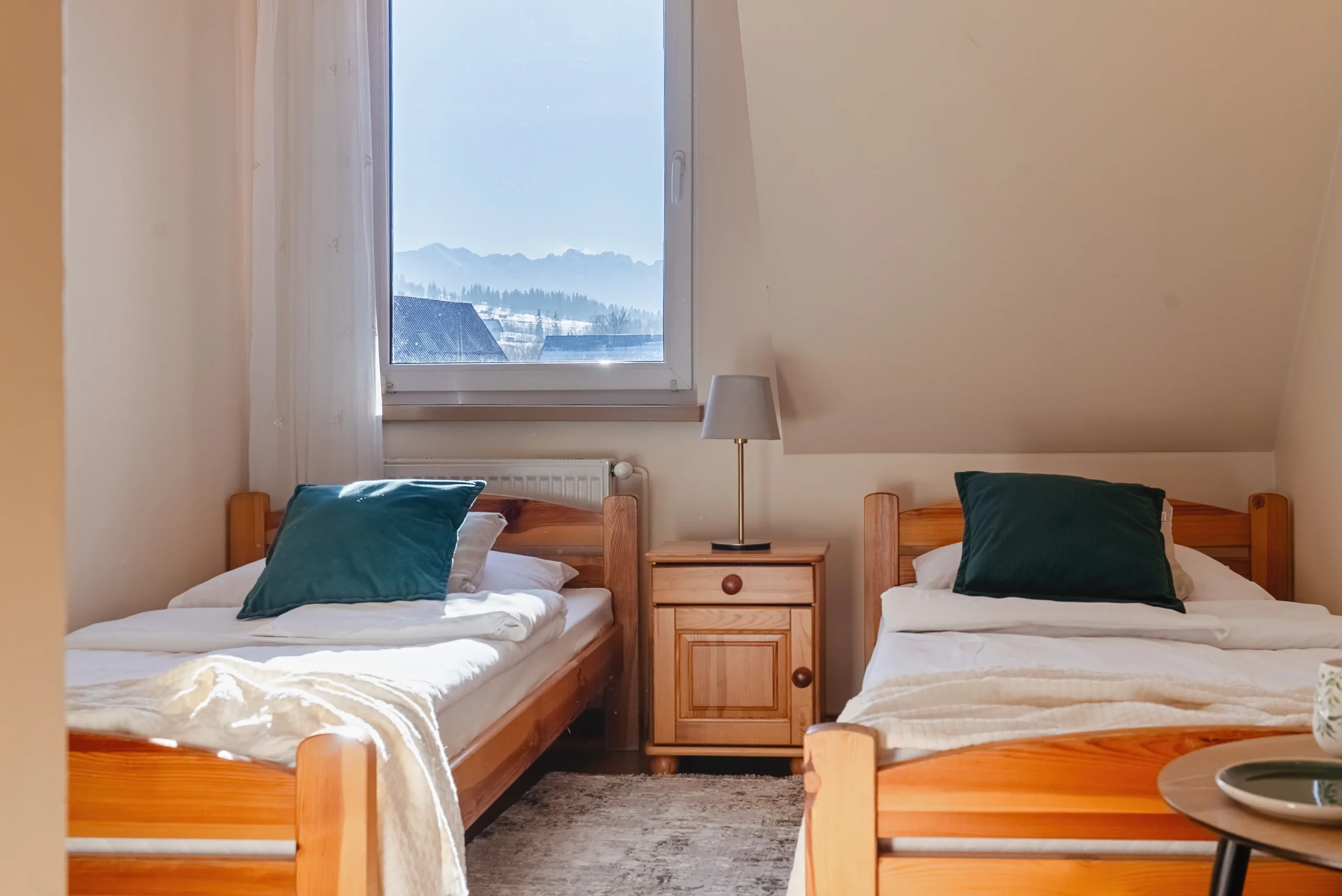 Pokój 4 to jasne, przytulne wnętrze idealne dla dwóch osób, które chcą odpocząć w spokojnym miejscu z wyjątkowym widokiem na Tatry. Komfortowe pojedyncze łóżka, naturalne materiały i minimalistyczny wystrój tworzą atmosferę sprzyjającą relaksowi po aktywnym dniu w górach.