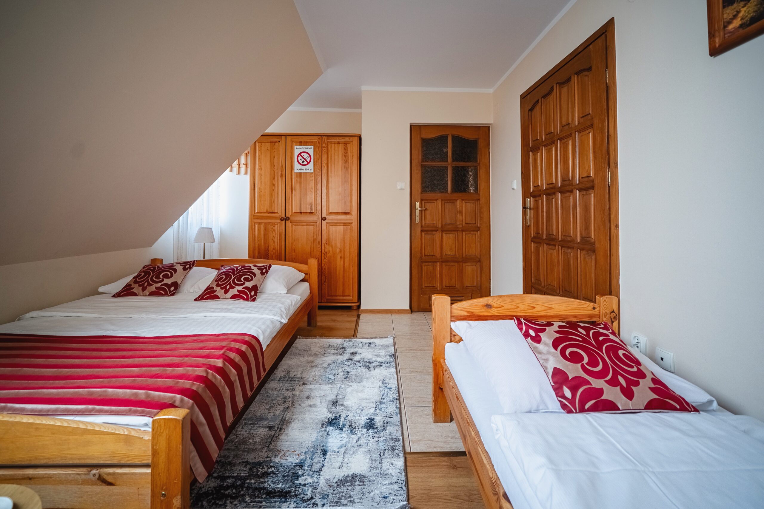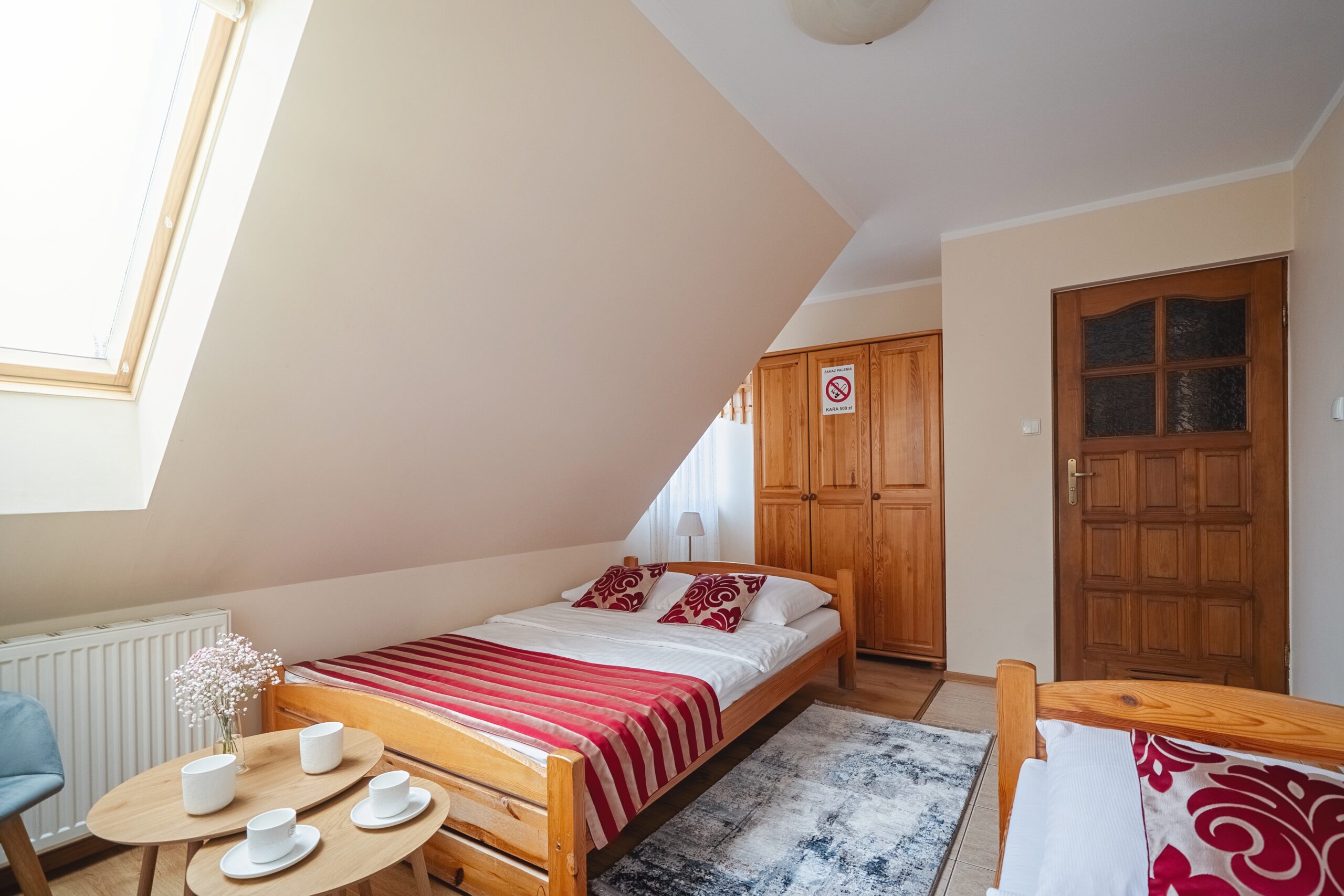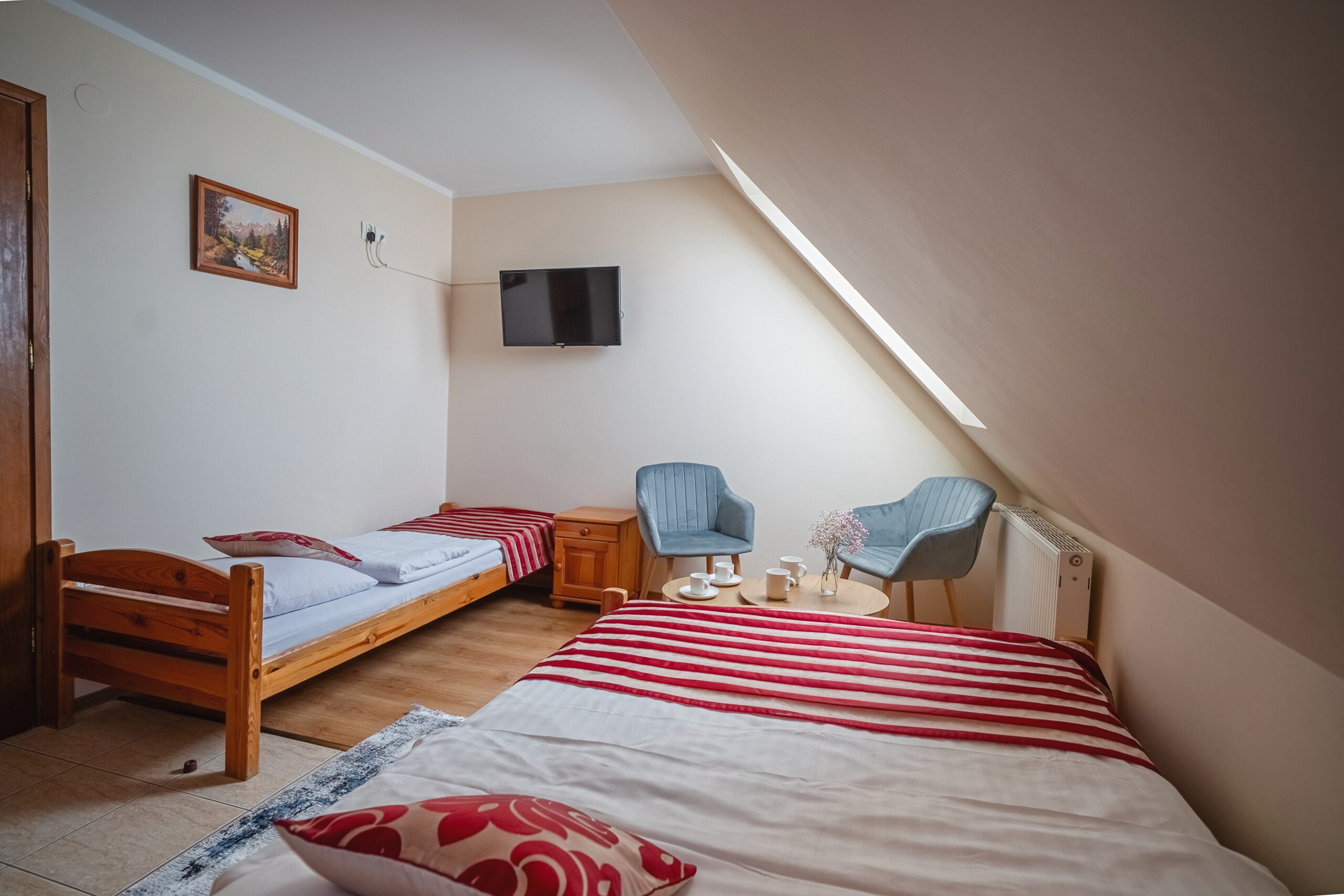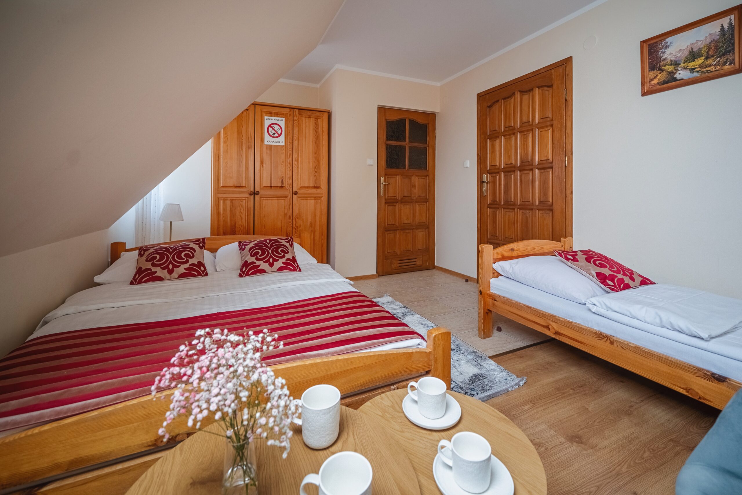 Pokój 6 to przytulna i funkcjonalna przestrzeń idealna dla trzech osób. Jasne wnętrza, ciepłe drewniane akcenty i widok na okolicę tworzą atmosferę sprzyjającą wypoczynkowi po dniu pełnym atrakcji w Tatrach.