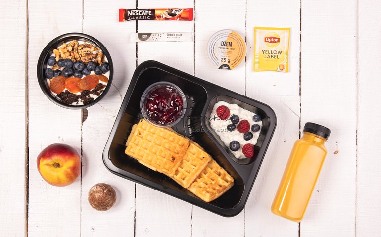 mini gofry • konfitura wiśniowa • domowy twarożek z owocami • jogurt z dodatkami • ciastko • owoc • napój owocowy • kawa • herbata • cukier • dżem lub nutella
