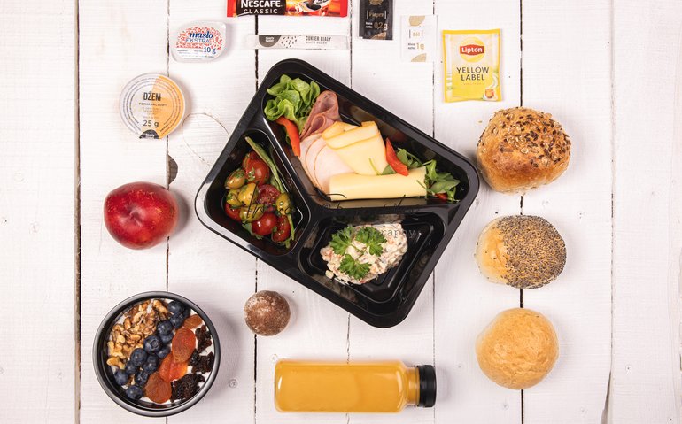 2 rodzaje sera • dwa rodzaje wędliny • sałatka ze świeżych warzyw • pasta śniadaniowa • rukola • sałata lodowa • jogurt z dodatkami • 3 rodzaje pieczywa • ciastko • owoc • napój owoców • kawa • herbata • cukier • dżem lub nutella • sól • pieprz • masło